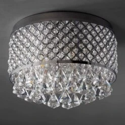 Add some sparkle to your ceiling with our modern, flush-mount light fixture. Faceted crystals are set into a chic diamond trellis of chrome-finished metal, and finished with a collection of crystal drops. This light fixture adds a touch of glamour to your hallway, bedroom or bathroom. This 11 5″ tall light fixture is large enough to fit ceilings 8 to 10 feet high.