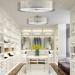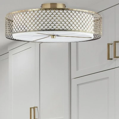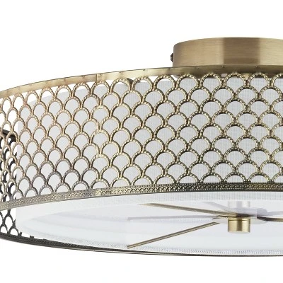 Bring glam style to your overhead lighting with this chic and unique Brushed Gold Metal Screen Ceiling Light from River of Goods. Designed in a shiny brushed gold finish for glam style, the metal canopy on this semi-flush mount ceiling light features allover clamshell-shaped cutouts for a touch of art deco flair. A white fabric shade underneath helps soften both the look and the light emitted from the two-bulb light kit. Great for placing above a sleek formal dining table, in your entry hallway or as a focal point in your living room, this metal and fabric ceiling light is sure to add instant style to your interior decor.