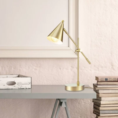 The Tacoma Desk Lamp from Novogratz x Globe Electric offers a task light in a clean, tidy package with a trendy cone shape shade and a stylish matte brass finish. The adjustable brass balance arm and tilting lamp head lets you direct the light where you need it most while creating ideal lighting ambiance for any situation. The sculptural design adds a modern touch to your office, bedroom or living room and acts as the statement piece to tie your interior design together. Decorate with the Novogratz and Globe Electric – lighting made easy.