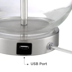With a beautiful design and modern features, these accent table lamps are a wonderful addition to a living room or bedroom. In a convenient set of two, they come in curving clear glass bodies, with brushed nickel finish accents that add a contemporary look. On top is a double shade design, with a transparent blue shade that encases an opaque white shade for eye-catching effect. Each lamp has a USB port built into the base, designed to charge smartphones and other handheld devices.