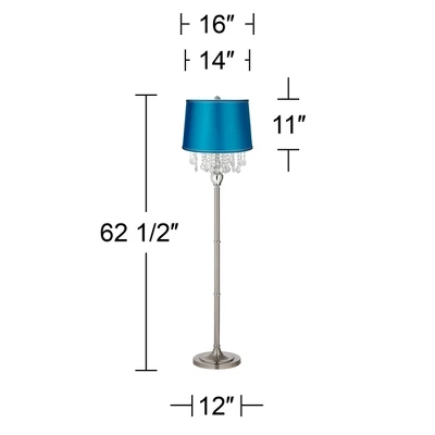- Turquoise satin drum shade chandelier floor lamp with crystal strands.