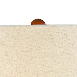Inspired by a Mid-Century aesthetic influenced by clean lines and a minimalist architectural profile, this stunning ceramic table lamp is topped with an off-white tapered drum shade. The wood material in the neck and base are mirrored in the ball finial on top for a cohesive look. A stylish lighting solution for any room in your home. Tabletop dimmer included.