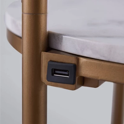 Illuminate your space while adding a functional surface with the Teamson Home Taelyn Floor Lamp End Table with Storage Shelf and Built-In USB. This table and lamp combination features a metal base with a gold finish, a white drum shade, and a faux marble tabletop for a modern addition to your bedroom or living space. This side table also includes a built-in USB port right next to the lamp to keep your devices charged and within reach. With a storage shelf under the tabletop, this table provides plenty of space for your phone, remotes, books, and other small items. Constructed from durable materials, this lamp is built for long-lasting use. Purchase this table and lamp alone or with a high-quality Teamson accent chair to complete your reading nook. For easy assembly, step-by-step instructions are included. The Teamson Home Taelyn Floor Lamp End Table with Storage Shelf and Built-In USB measures 14″ x 14″ x 64″ to fit easily into most spaces. Lightbulb not included.