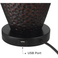 In a stylish set of two, these contemporary industrial table lamps offer a coordinating look for your living space. Each lamp comes in a textured hammered resin body, covered in a warm oiled bronze finish and accented in black. On top are faux leather drum shades that add to the rugged, natural feel of the overall design. At the bottom are built-in USB ports for charging smartphones and other devices.