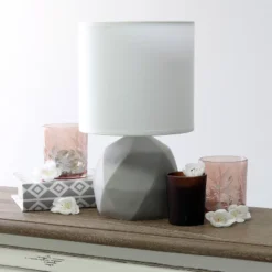 This mini lamp features a gray concrete geometric base and a white fabric drum shade. It is a lovely, inexpensive, and practical table lamp to brighten up any of your spaces in style! This modern styled lamp would be perfect for any living room, bedroom, office, kids room, or college dorm!