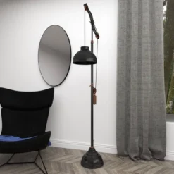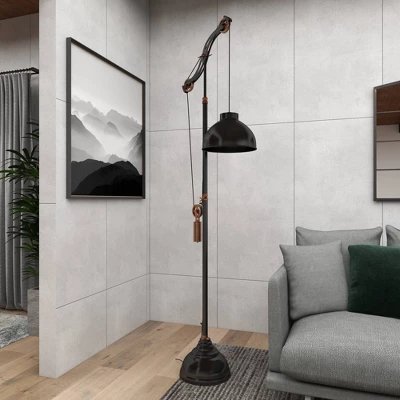 If you’re seeking a statement piece for your living room, bedroom, or office, this industrial floor lamp is your answer. It features a unique rope and pulley system with a steampunk aesthetic and 3 brass wheels holding the black electrical cord. A light tug on the brass handle will move the lamp up and down on the teeter totter pulley. The bulb is covered by round black aluminum with a reflective brass interior, as well as a rounded stacked base and adjustable height stem. The mechanical function and exposed hardware create a dynamic industrial decor look with a modern functionality. LED screw base standard bulb. This item has a 170” cord length. Suitable for indoor use only. Some assembly required. A bowl shaped shade made of metal. Convenient on/off foot switch on the 163″ cord. This item comes shipped in one carton.