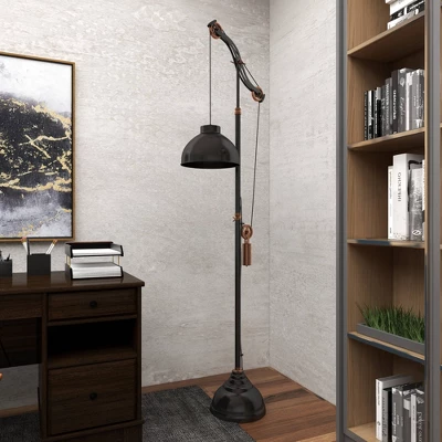 - Unique styled statement floor lamp that features a rope and pulley system that has steam punk vibes