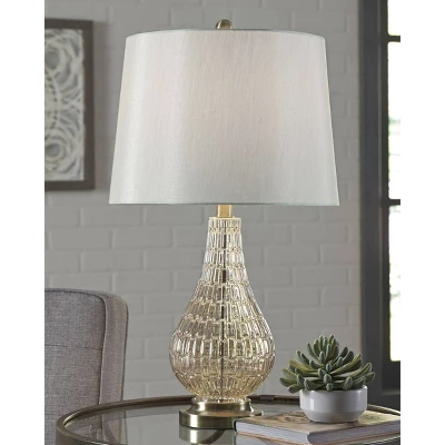 Let this table lamp feed your design appetite. The curvy silhouette permeates your room with contemporary romance, while the champagne-hued glass body is a soft and feminine finish. A brass-tone base finesses the look with a sleek touch. Table lamps are the perfect way to spice up your room, all while providing warm ambient lighting to set the mood. Brighter, well-lit spaces always tend to look larger, smarter and so much more visually appealing. With our wide variety of table lamp shapes, sizes and styles, we’d say your future is definitely looking bright. The trusted source for stylish furniture, lighting, rugs, accessories and mattresses for every taste and budget, our wide assortment brings your space to life with furniture and decor that show off your style personality.