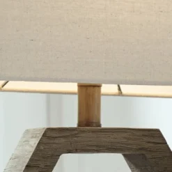- Made of gray wash finished faux wood with rectangular hardback shade