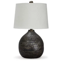 Who knew geometry could be so stylish? This table lamp’s hexagonal base sports a stunning gray washed finish over faux wood. Angular silhouette brightens up your space with the right amount of style and light. Gray washed finished faux wood table lamp. Rectangle hardback shade. On/off switch. (1) E26 socket, type A bulb recommended – 60 watts max or 13 watts max CFL. Signature Design by Ashley is a registered trademark of Ashley Furniture Industries, Inc.