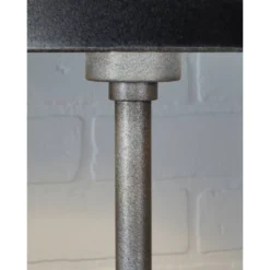 - Made of gray wash finished faux wood with rectangular hardback shade