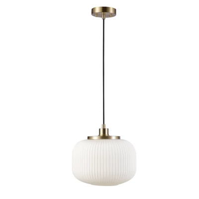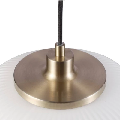 A frosted ribbed glass shade hangs from a black cloth cord and matte brass canopy to offer a grandmillennial style pendant light that brings a warm glow to any room in your home. Suitable for the living room, dining room, den, or office, the Novogratz x Globe Lily Pendant Lighting can be adjusted to comfortably fit the room of your choice and can be hardwired to suspend from any sloped ceiling. The possibilities are endless when it comes to hanging this 1-Light Pendant. The Novogratz and Globe Electric – lighting made easy.