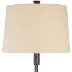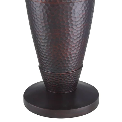 - Tempered glass tray tables. Space-saving design, use as an end table or nightstand. Oil rubbed bronze finishes on hammered metal. Oatmeal drum shades. 8-foot long brown cords.