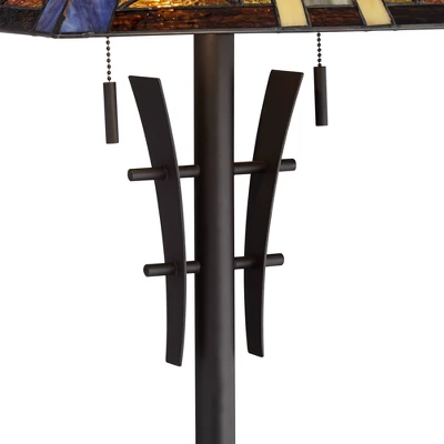 This beautiful floor lamp blends different style elements to create an eye-catching design. Stark geometric lines compose the bold and bright Tiffany-style art glass shade while gentle curves of the Asian-inspired iron base balance the design. This stylish contemporary floor lamp will make a statement when placed in virtually any living space.