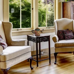 The Tiffany Style Teapot Lamp from Hastings Home illuminates your space while adding a touch of elegance to your home. Designed with 252 stained glass pieces and 30 cabochon accents, this handcrafted lamp is sure to provide a soft ambient light that is perfect for your living room, entryway, bedroom, or office.