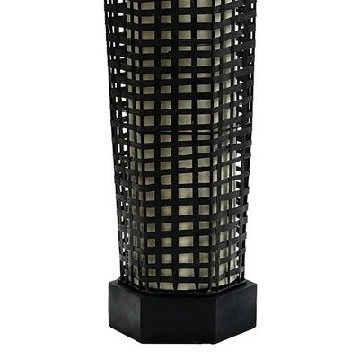 - The black woven rattan outer shade to this up light floor lamp is made thick and sturdy in order to hold its shape surrounding the linen interior shade.